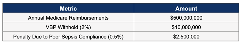 - In this example, Hospital Y’s low sepsis compliance score in the safety domain triggers a 0.5% penalty. This could result in roughly a $2.5M reduction in Medicare reimbursements for the next fiscal year.